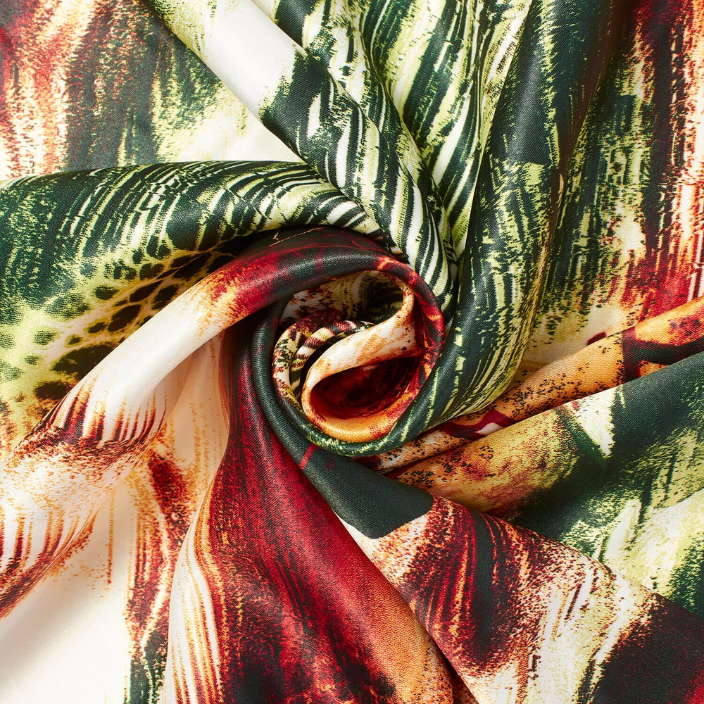 | Fabric Style | Abstract Striped Floral Animal Print Polyester Charmeuse Satin is a soft textured, lightweight, and vibrantly colored fabric. |