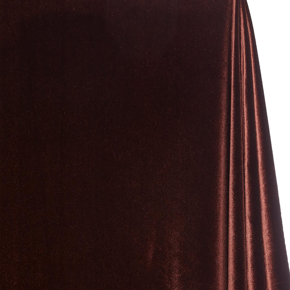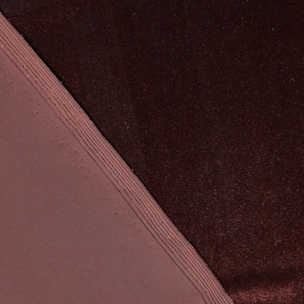 Experience the luxurious feel of Espresso Brown Glow stretch velvet fabric, crafted from a blend of 90% polyester and 10% spandex. Measuring 60 to 61 inches wide, this high-end velvet offers a soft, smooth texture with a subtle 20% vertical stretch, making it ideal for elegant apparel and upholstery projects that require both comfort and durability. Its rich espresso brown hue adds depth and sophistication to any design.