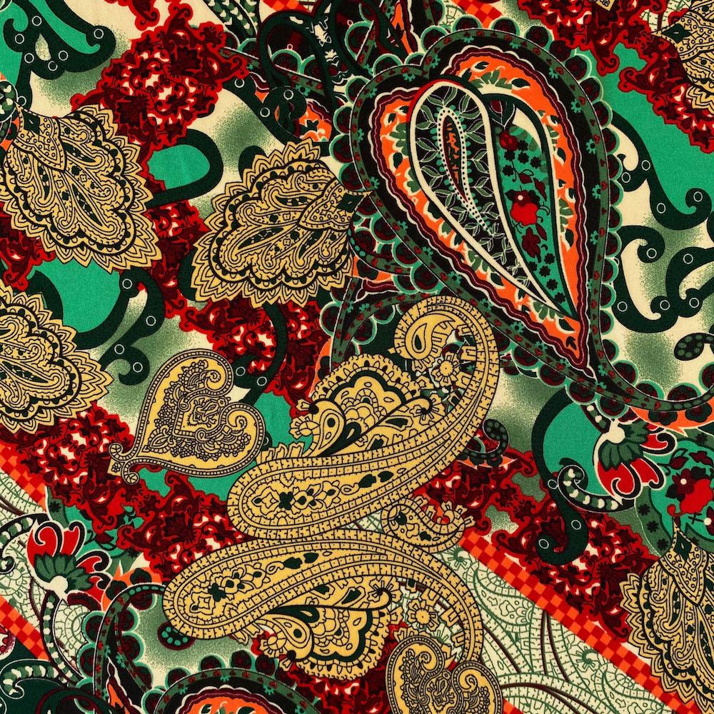 | Design | The fabric showcases a striking paisley print, with intricate patterns repeating every 6.5 inches vertically, adding depth and timeless charm to its design. Whether used for classic bandanas or fashion-forward projects, this paisley delivers a balance of tradition, versatility, and visual appeal. |