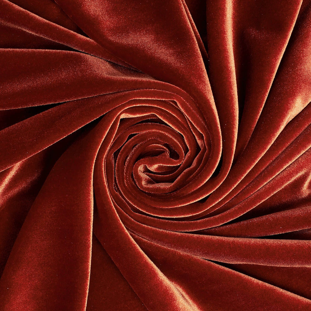High-Fashion Rust Stretch Velvet Fabric combines 90% polyester and 10% spandex to deliver a luxurious, durable textile with excellent stretch and recovery. Measuring 60/61 inches wide with a 20% vertical stretch, this velvet is ideal for sophisticated curtains, elegant upholstery, stylish cushions, and refined clothing. Its rich rust color and soft