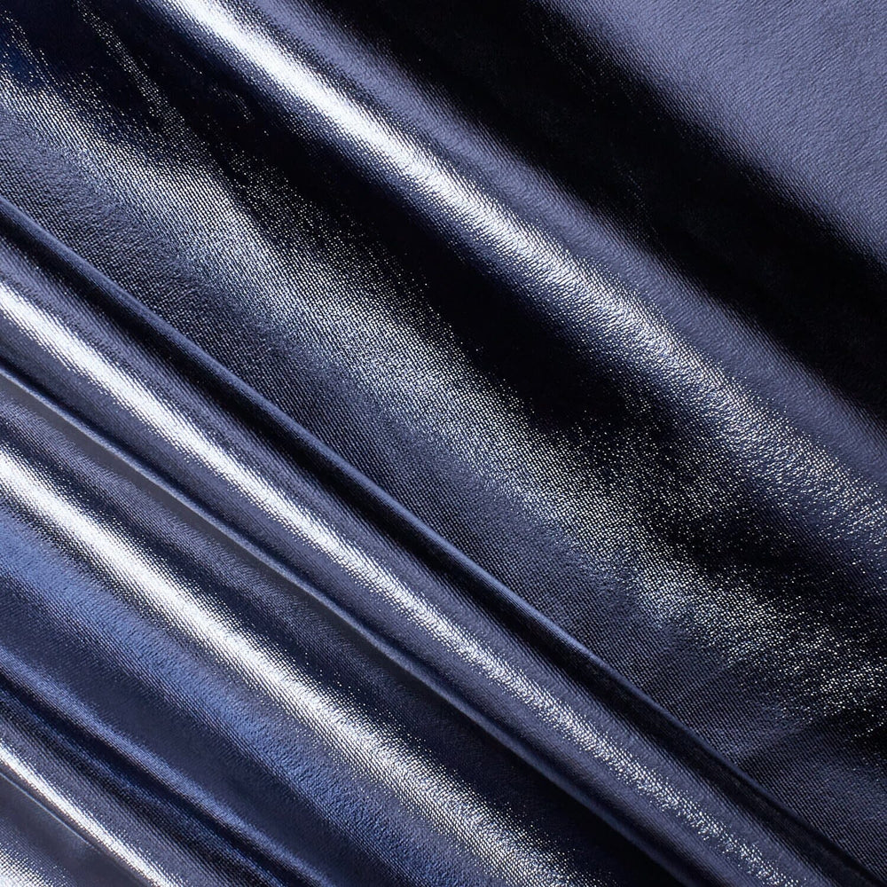 This navy-blue Dazzling Lamé Stretch fabric combines 49% nylon with 51% metallic fibers to create a foil lame interlock knit that offers both flexibility and striking reflectivity. Measuring 60/61 inches wide and sold by the yard, it is ideal for expert designers seeking a high-impact material that stretches comfortably while delivering a shimmering, eye-catching finish. Perfect for performance wear, costumes, or statement pieces requiring both durability and dazzling visual appeal.