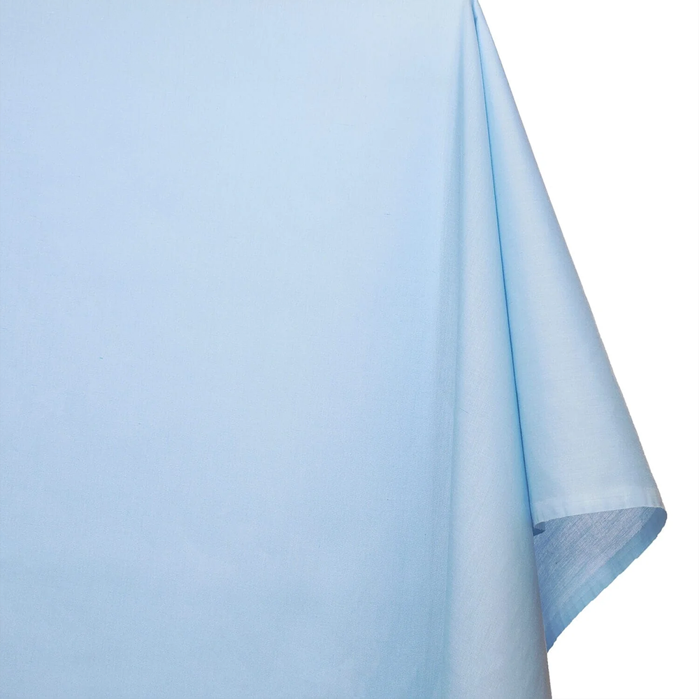 <Experience the ideal fabric for your custom apparel projects with this 50/50 poly-cotton broadcloth in a soft light blue. Combining 95% polyester for durability and 5% cotton for comfort, it offers a smooth, breathable feel perfect for everyday wear or tailored designs. Sold by the yard and available nationwide, this fabric supports your creative vision while ensuring lasting quality.