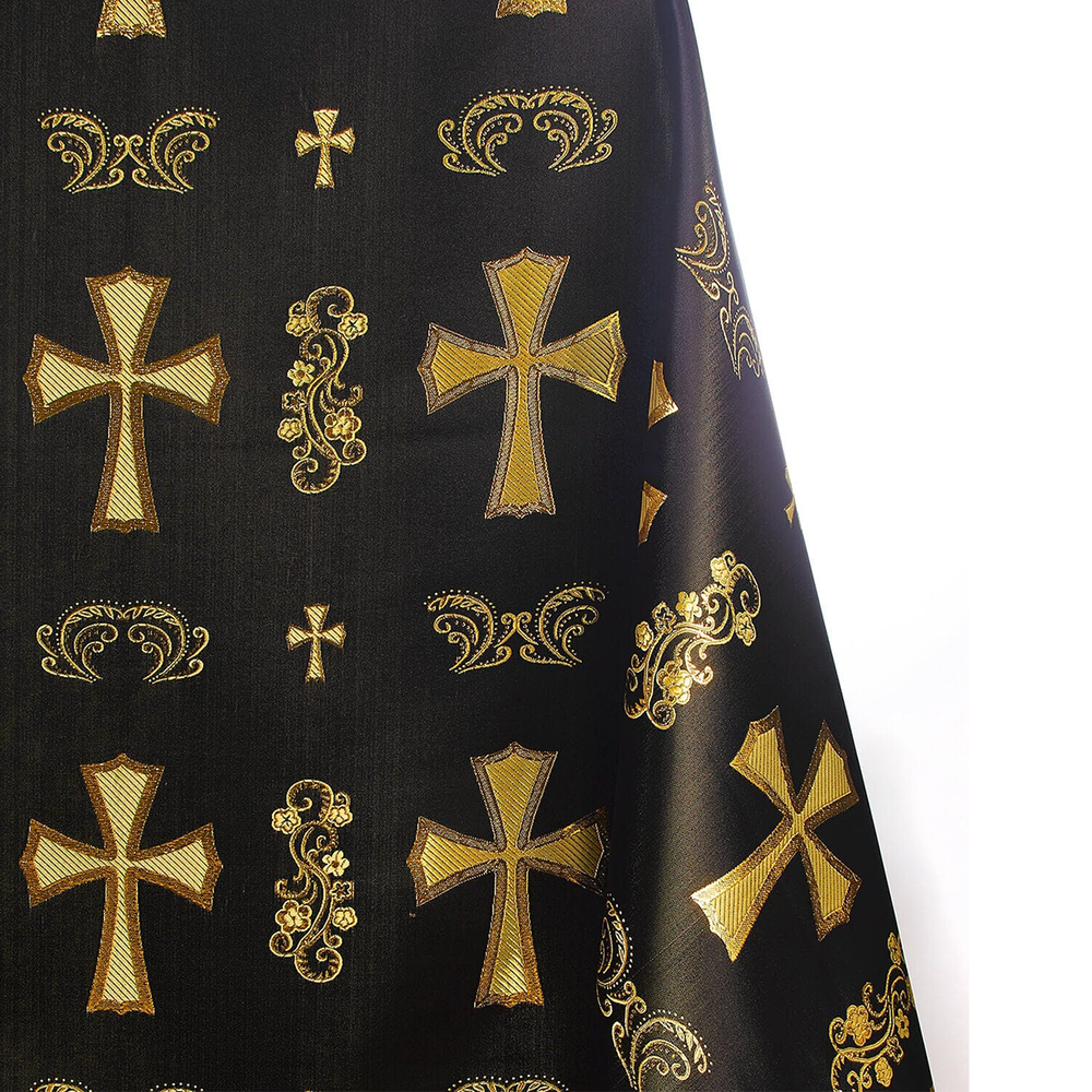 | Fabric Style | Metallic Clerical Cross Brocade is made with 41% Nylon, 36% Polyester, 23% Metallic fibers, and has a beautiful sheen and detailed cross patterns throughout. It has an extremely smooth surface with a silky flow when draped. Additionally, this fabric is double-sided so that you can choose which side better fits your needs. |