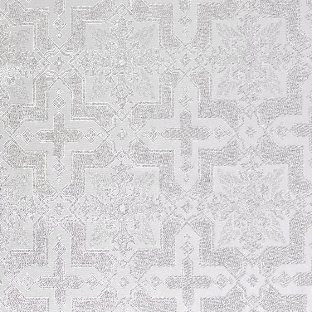 | Fabric | Ecclesiastical Metallic Brocade is a shiny and textured fabric that displays an elegant, double cross pattern all throughout the material. |